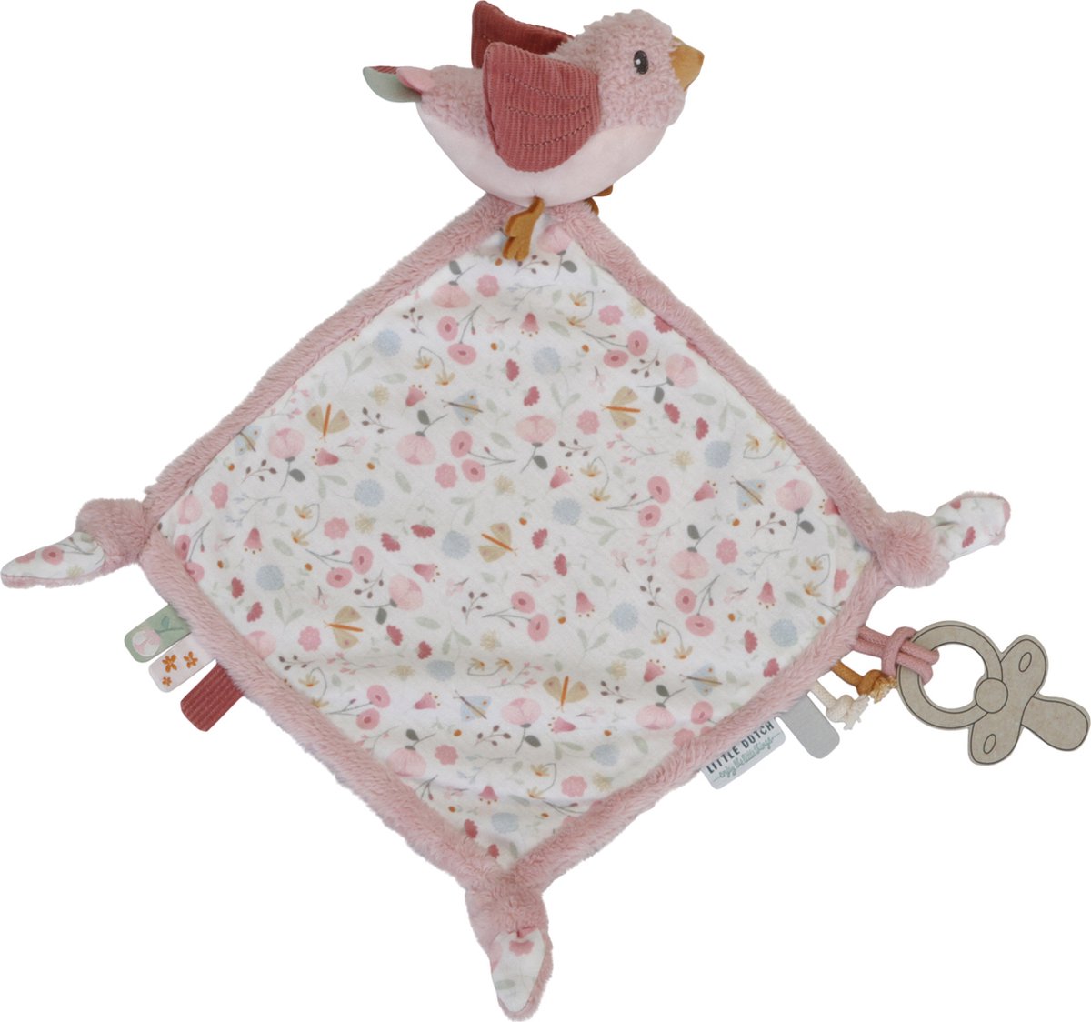 Zacht en zoet. Geen kinderkamer is compleet zonder een troostend knuffeldoekje binnen handbereik. Dat maakt het meteen een ideaal kraamcadeau. Deze variant van Little Dutch is versierd met onze nieuwe Flowers & Butterflies print. Het knuffeldoekje kalmeert en helpt een kleintje om in slaap te vallen. Het is voorzien van een zacht vogeltje, makkelijk vast te pakken knopen en leuke labels om te ontdekken. Oh, en je kunt gemakkelijk een fopspeen of bijtring bevestigen aan de katoenen lus.